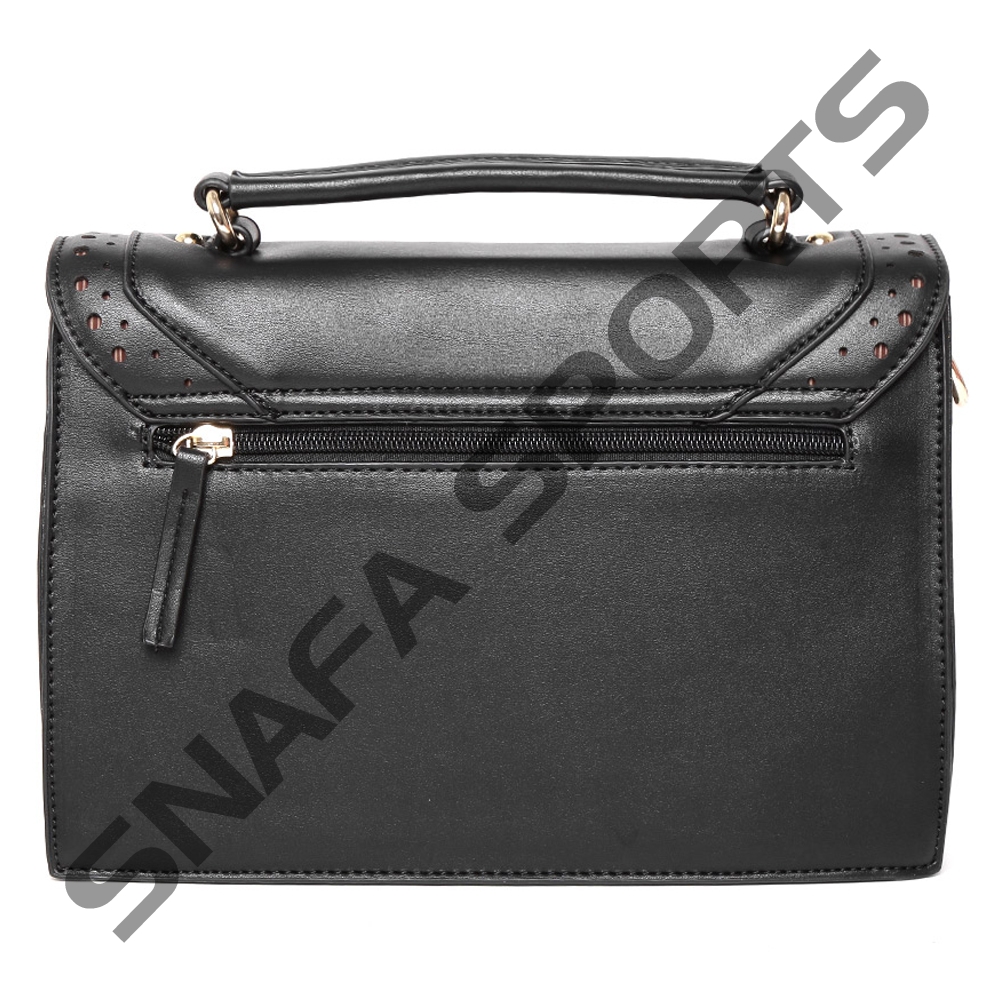 Black solid satchel with cut work detail, has a flip-lock closure